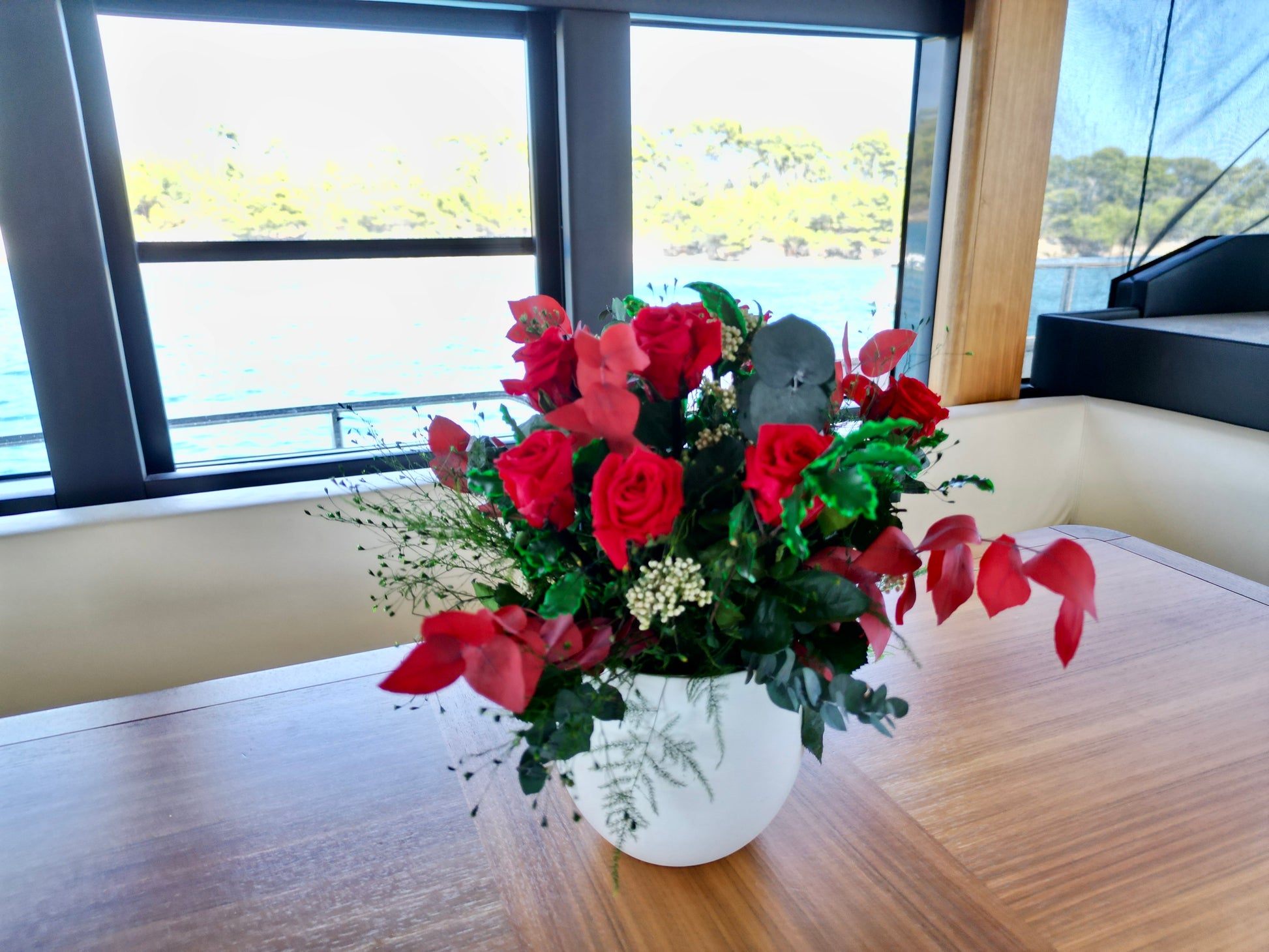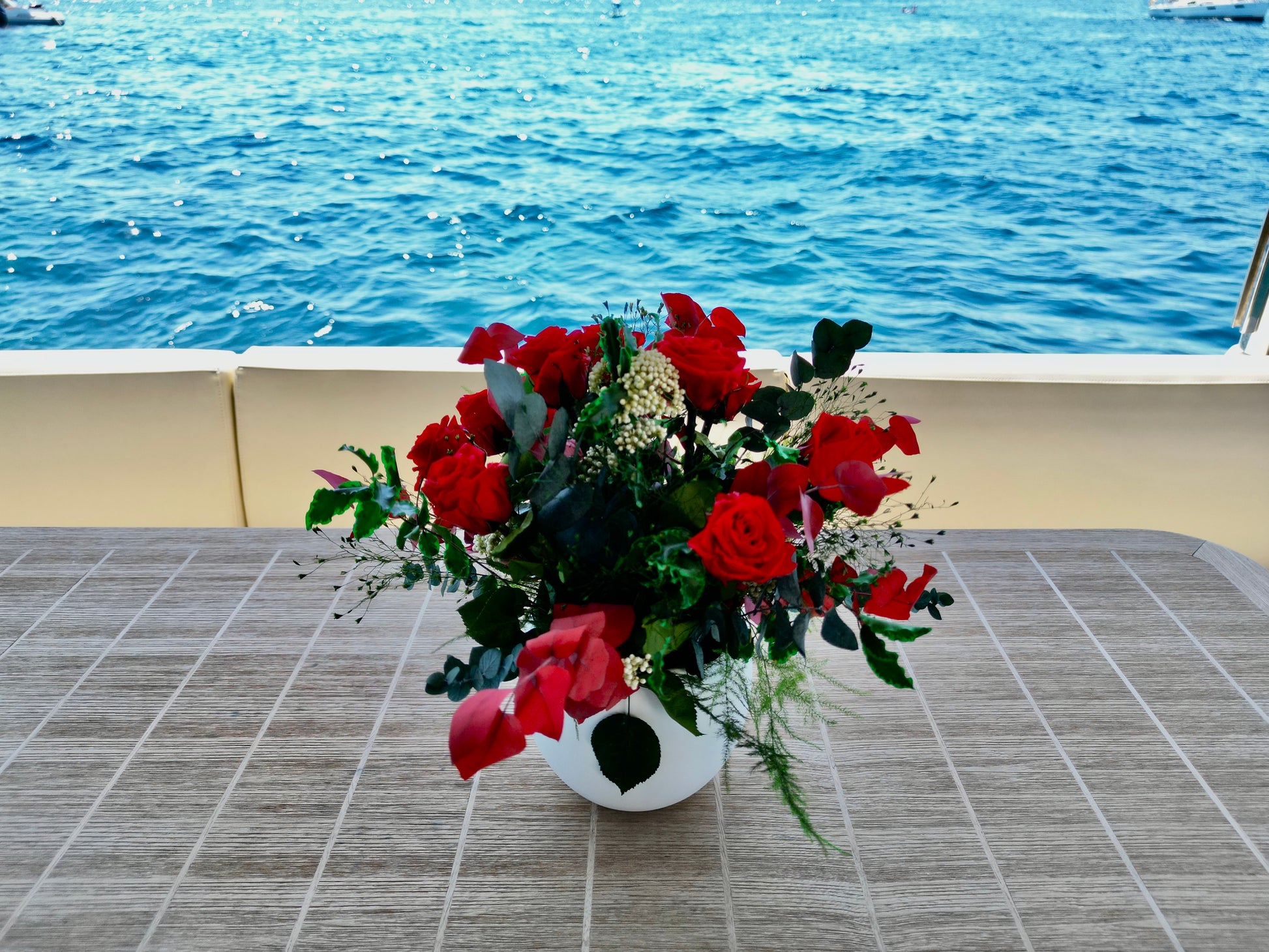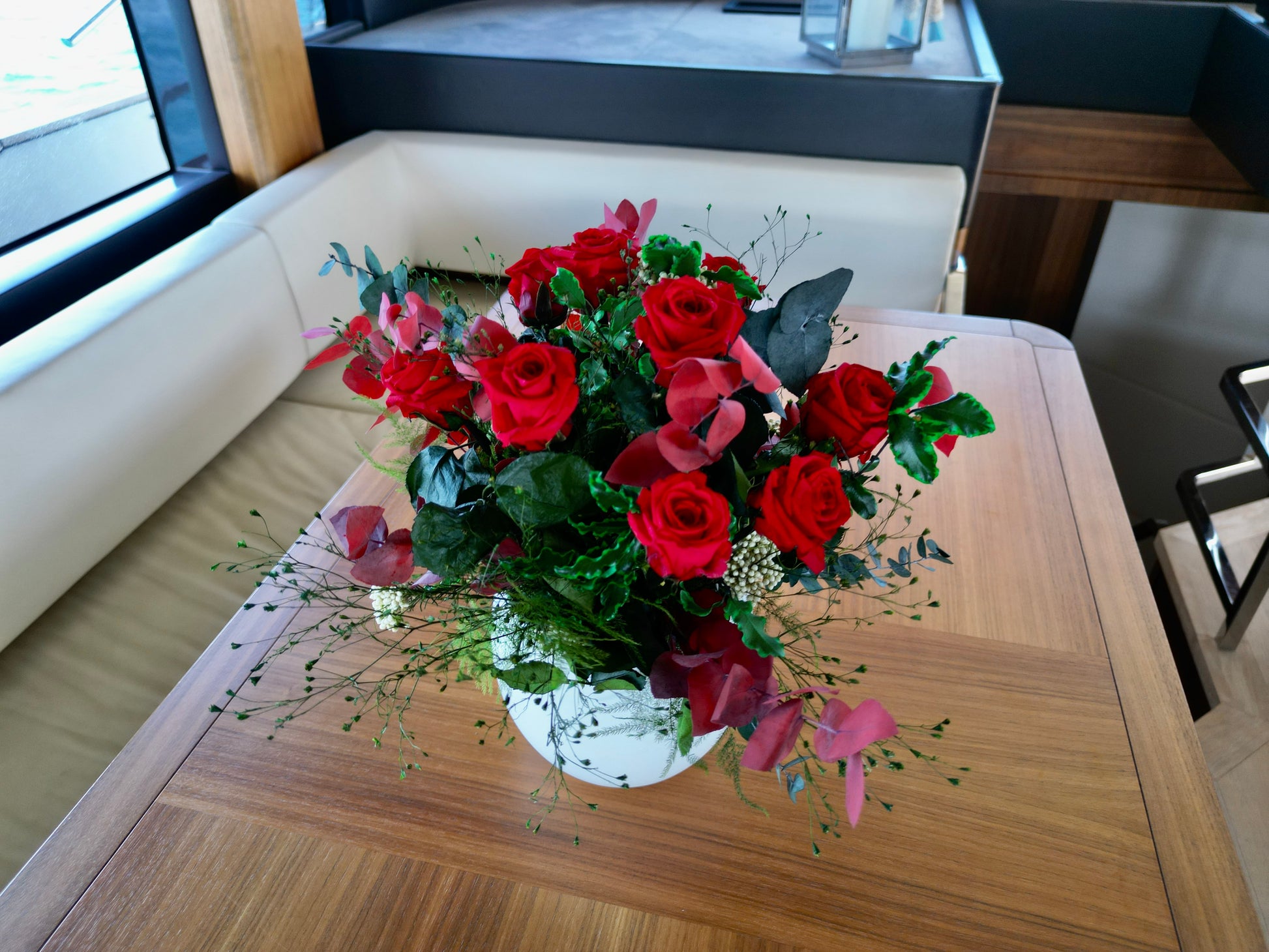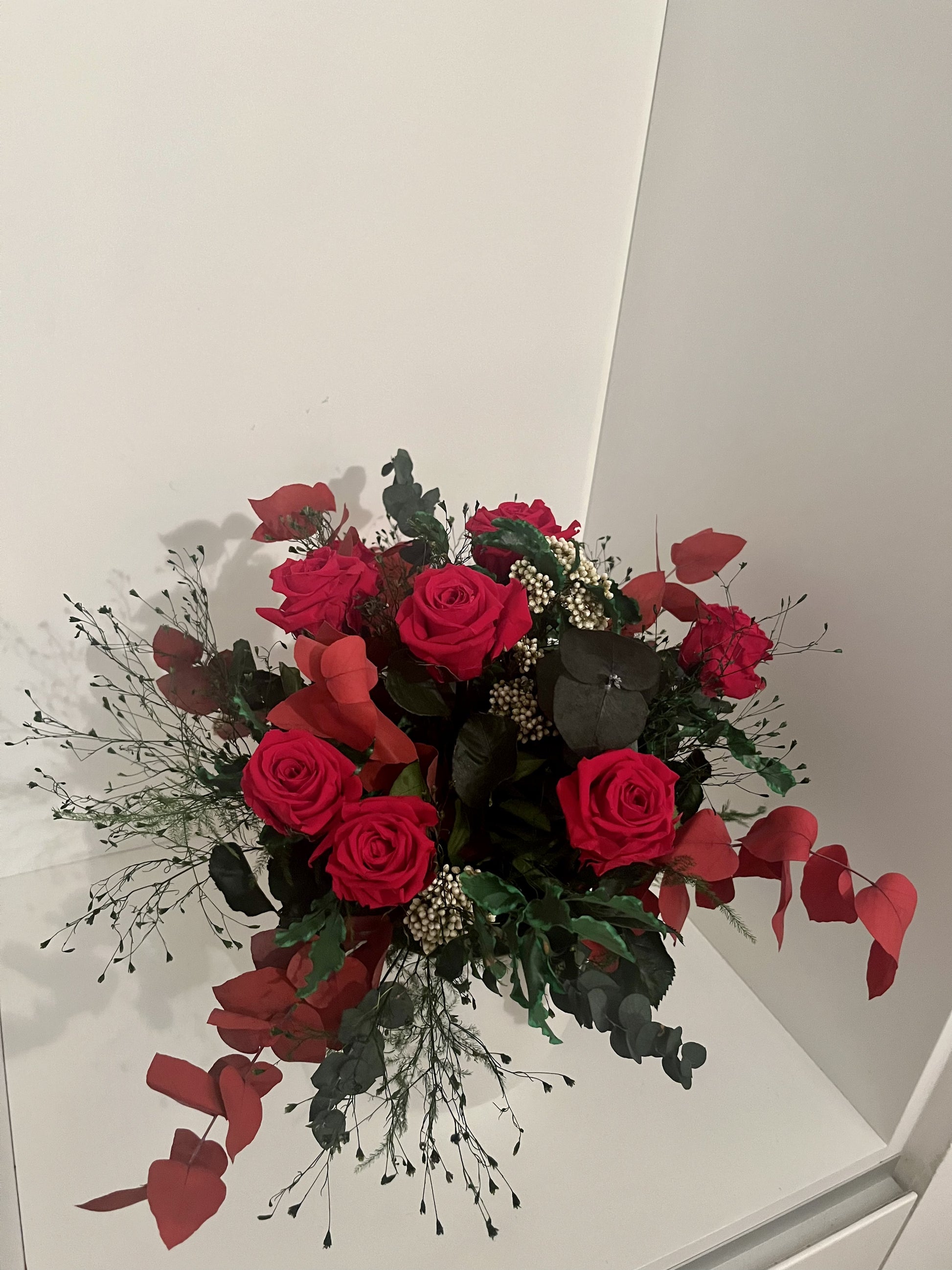 Introducing our captivating stabilized flower arrangement, a symphony of colors and nature's beauty. Delight in the vibrant hues of Red Eucalyptus Stuartiana, Green Eucalyptus Stuartiana, Green Pittosporum, Green Desert Star, and Green Asparagus Plumosus. Embrace the timeless allure of Roses and natural Diosmi, all meticulously preserved for everlasting joy. Discover nature's wonders in this exquisite creation.