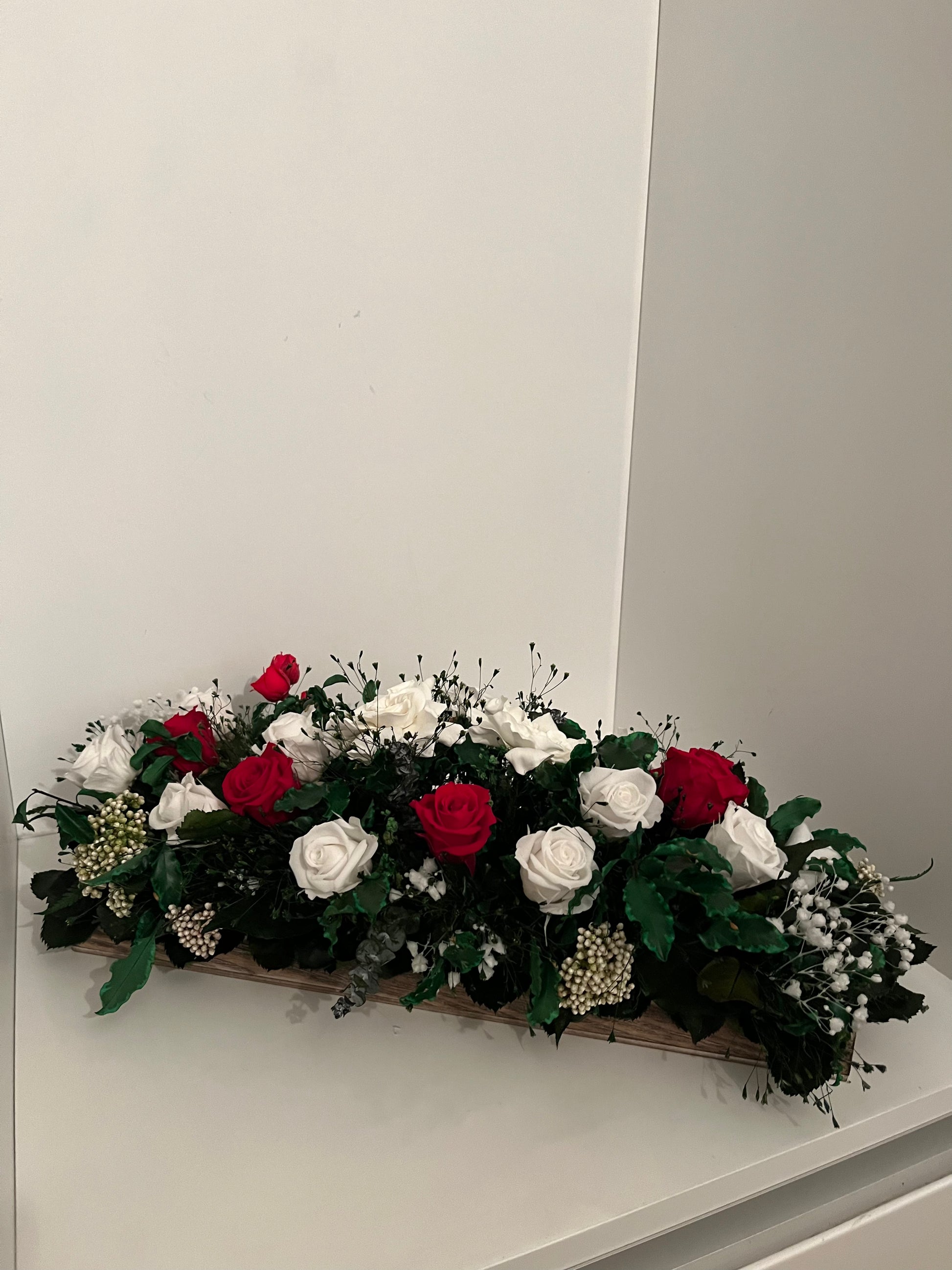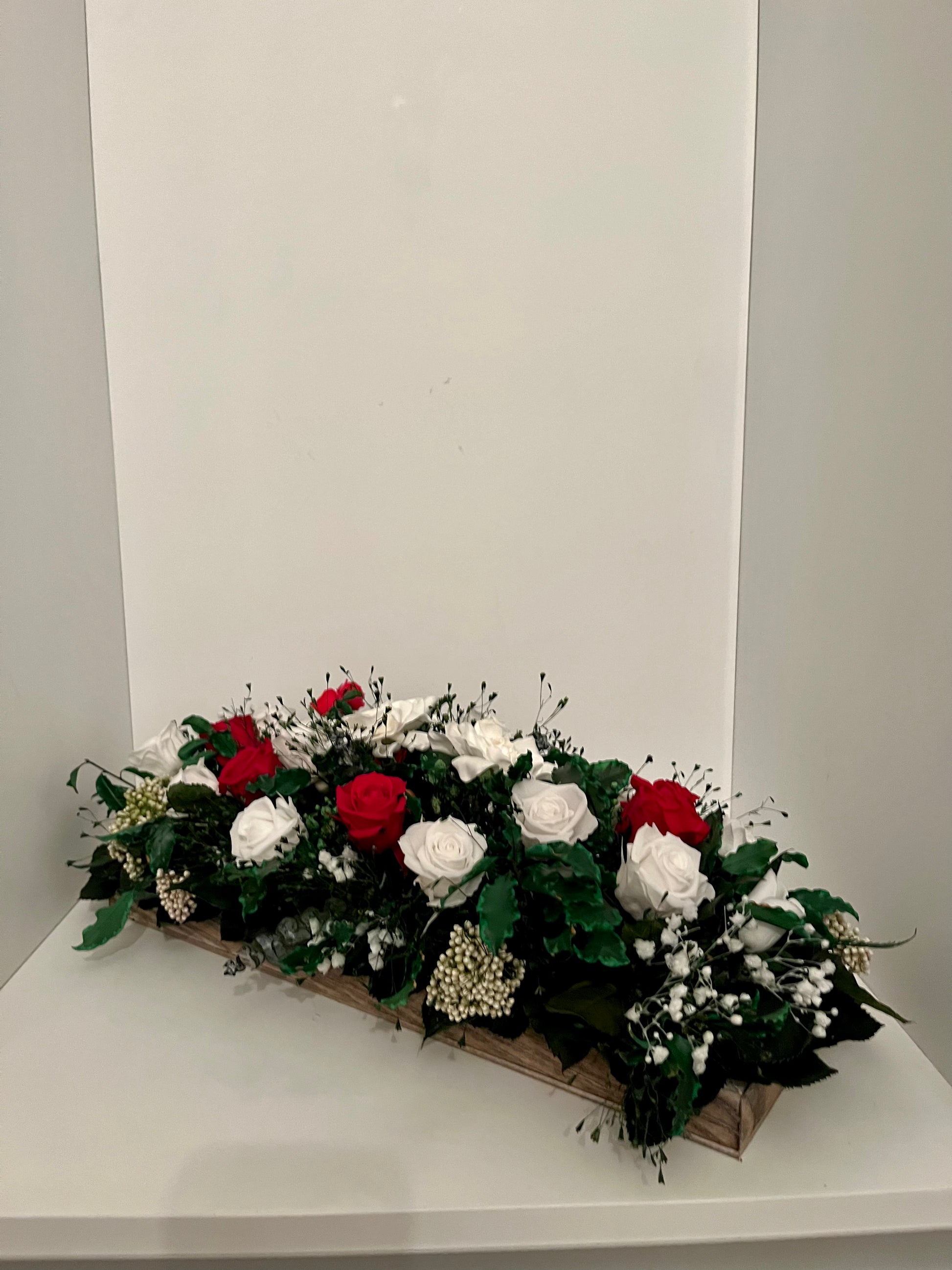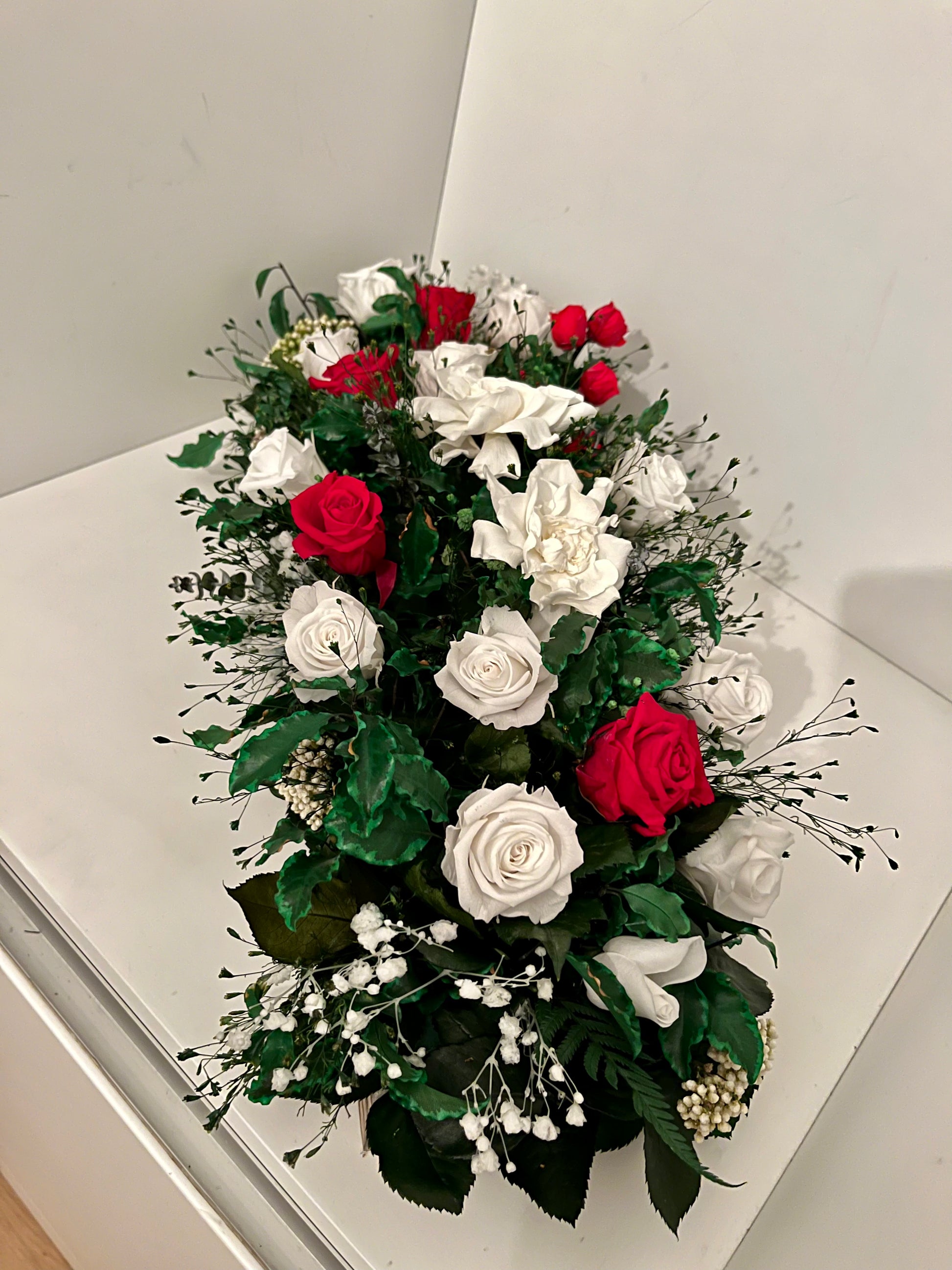 Introducing the captivating "Emma" Stabilized Flower Arrangement – a mesmerizing blend of white and red roses accompanied by an array of meticulously preserved foliage. Designed to radiate eternal beauty, "Emma" infuses sophistication into any space or occasion, making it an exquisite choice for both decor and thoughtful gifting.