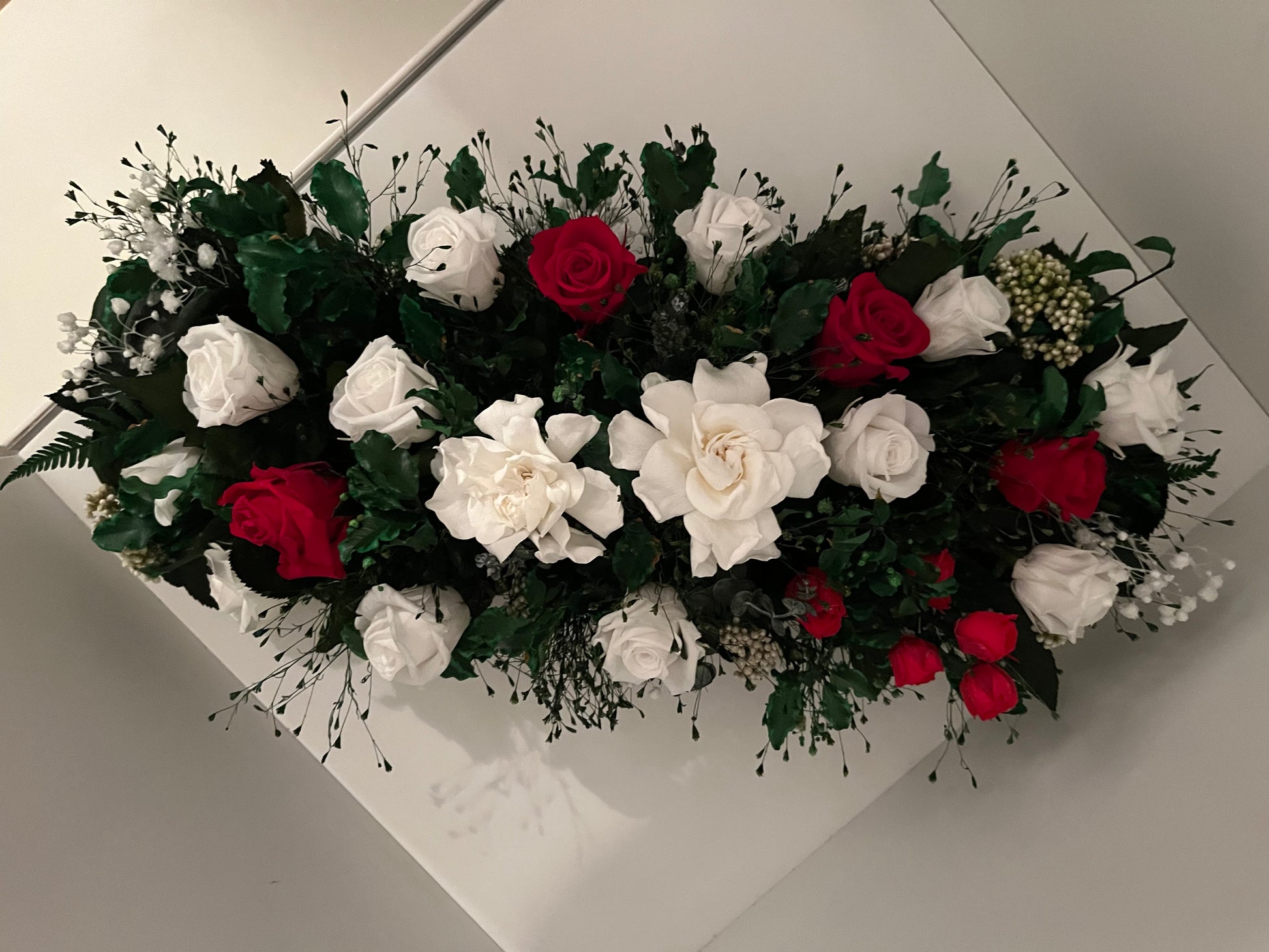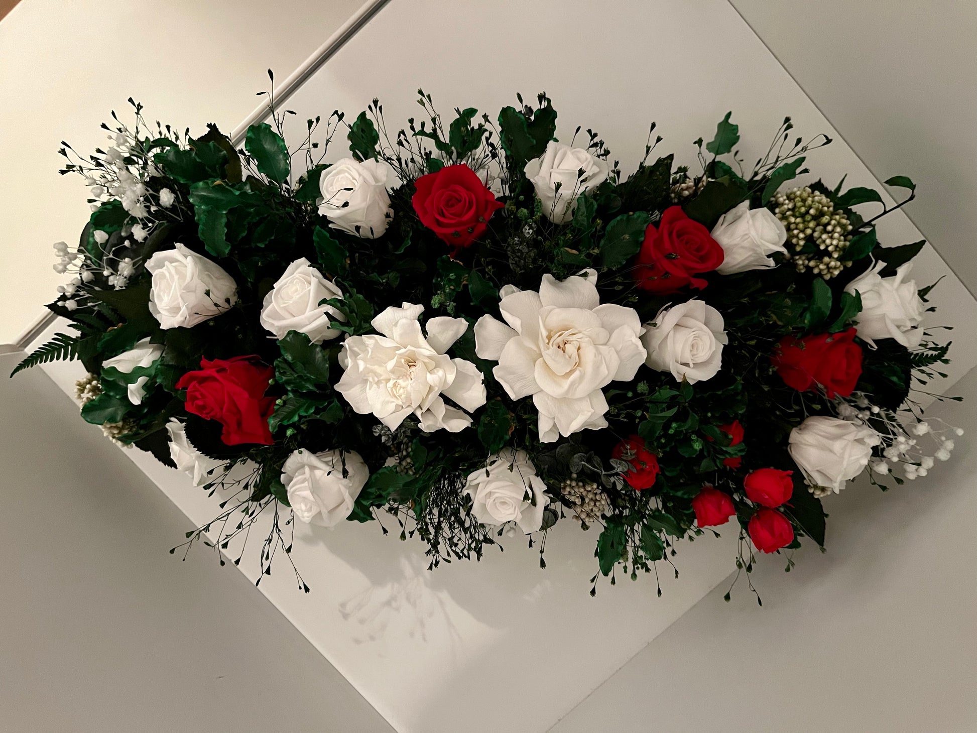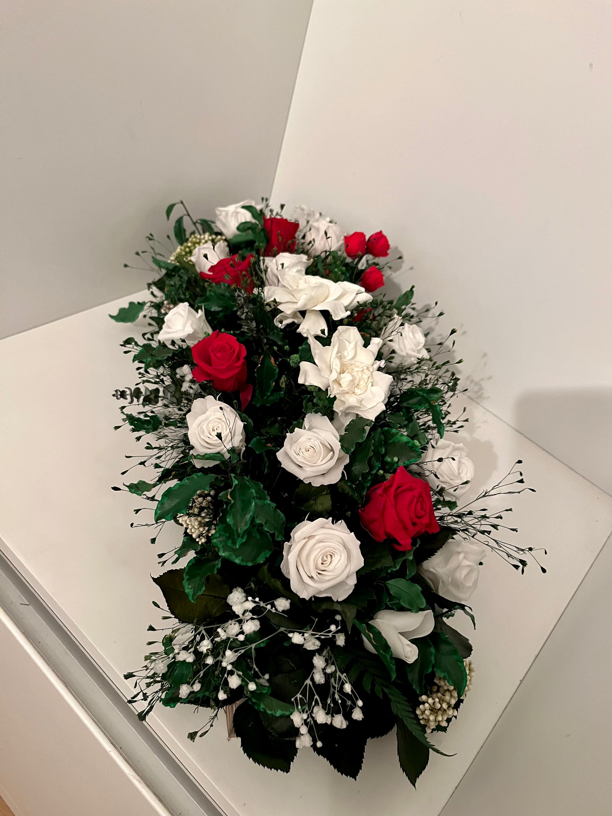 Introducing the captivating "Emma" Stabilized Flower Arrangement – a mesmerizing blend of white and red roses accompanied by an array of meticulously preserved foliage. Designed to radiate eternal beauty, "Emma" infuses sophistication into any space or occasion, making it an exquisite choice for both decor and thoughtful gifting.