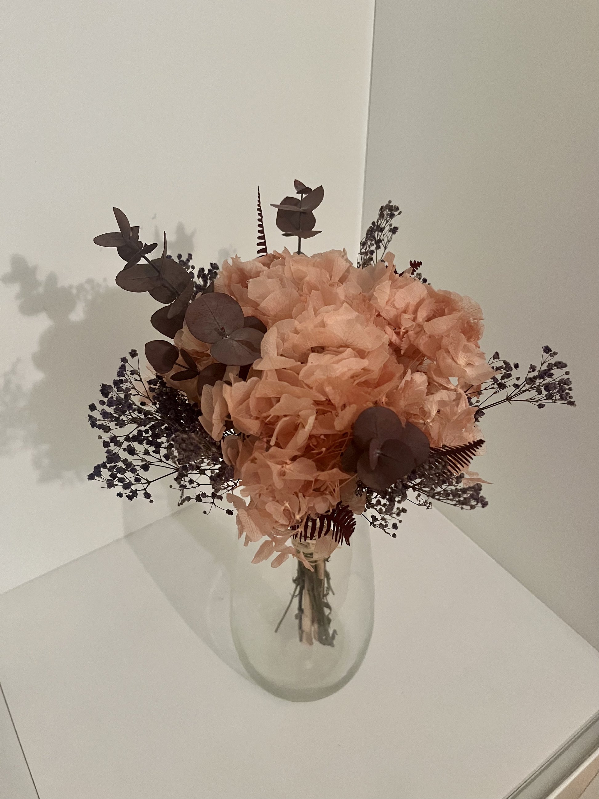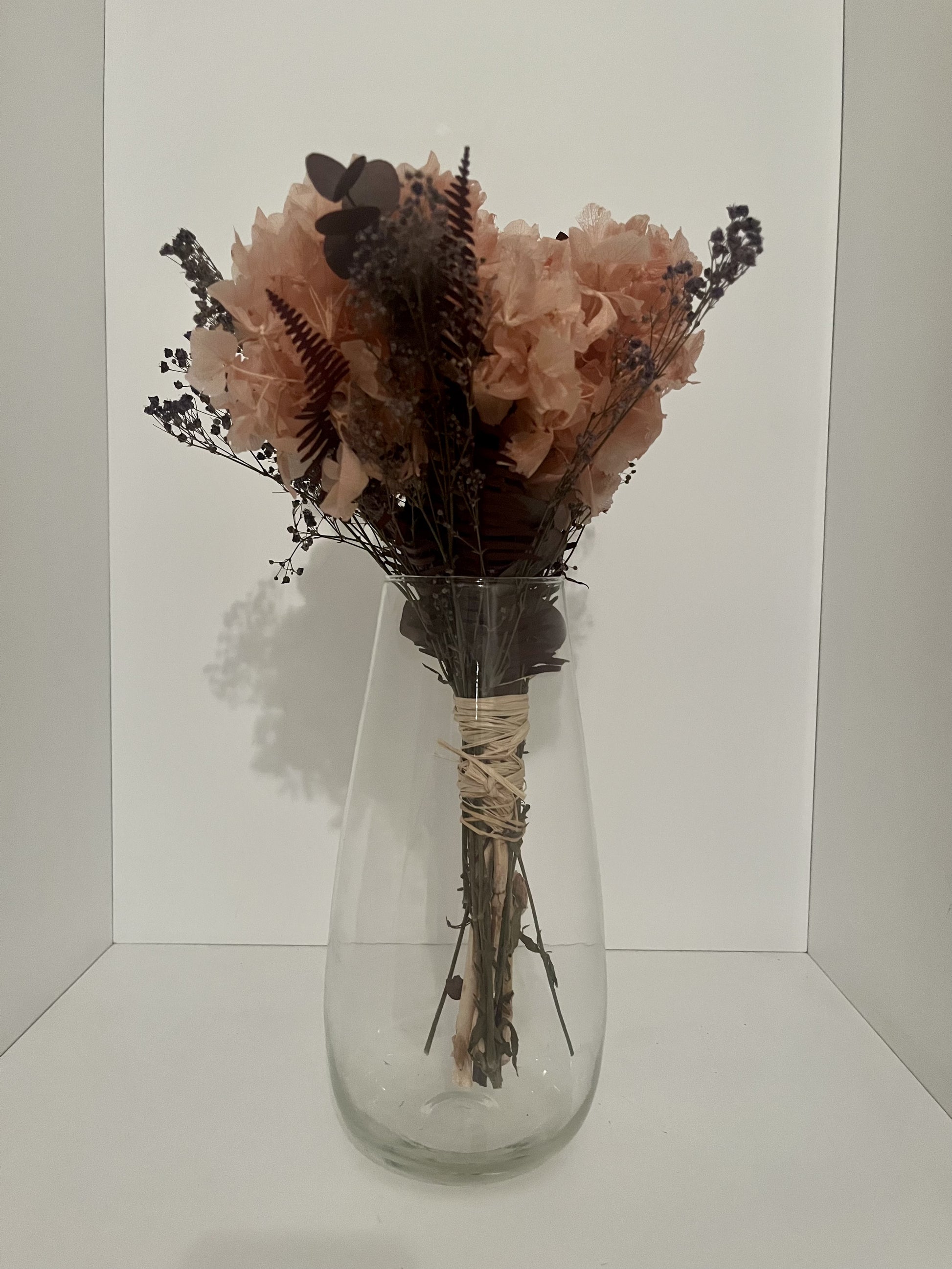 Introducing the Pink Matisse collection, where nature's palette comes alive. The "Pink Matisse" stabilized flower arrangement boasts the soft allure of Pink Hortensia, the rich elegance of Rouge Eucalyptus Stuartiana, and the enchanting touch of Purple Gypsophila. Enhanced by the vibrant fern in Rouge, this masterpiece is a symphony of colors. Meticulously preserved, each element captures nature's vibrancy. Elevate your space, capturing fleeting moments with this enchanting fusion of botanical artistry.