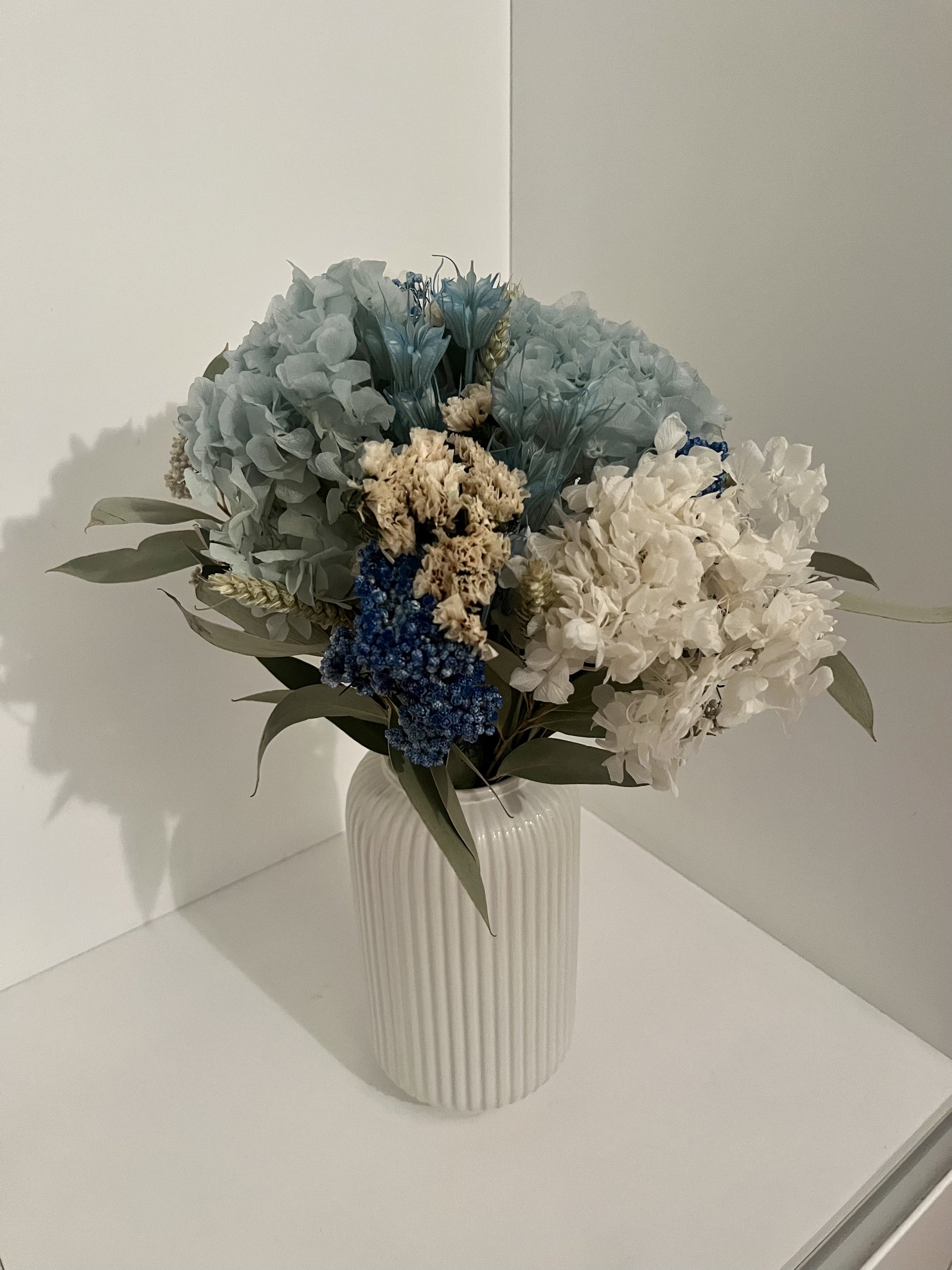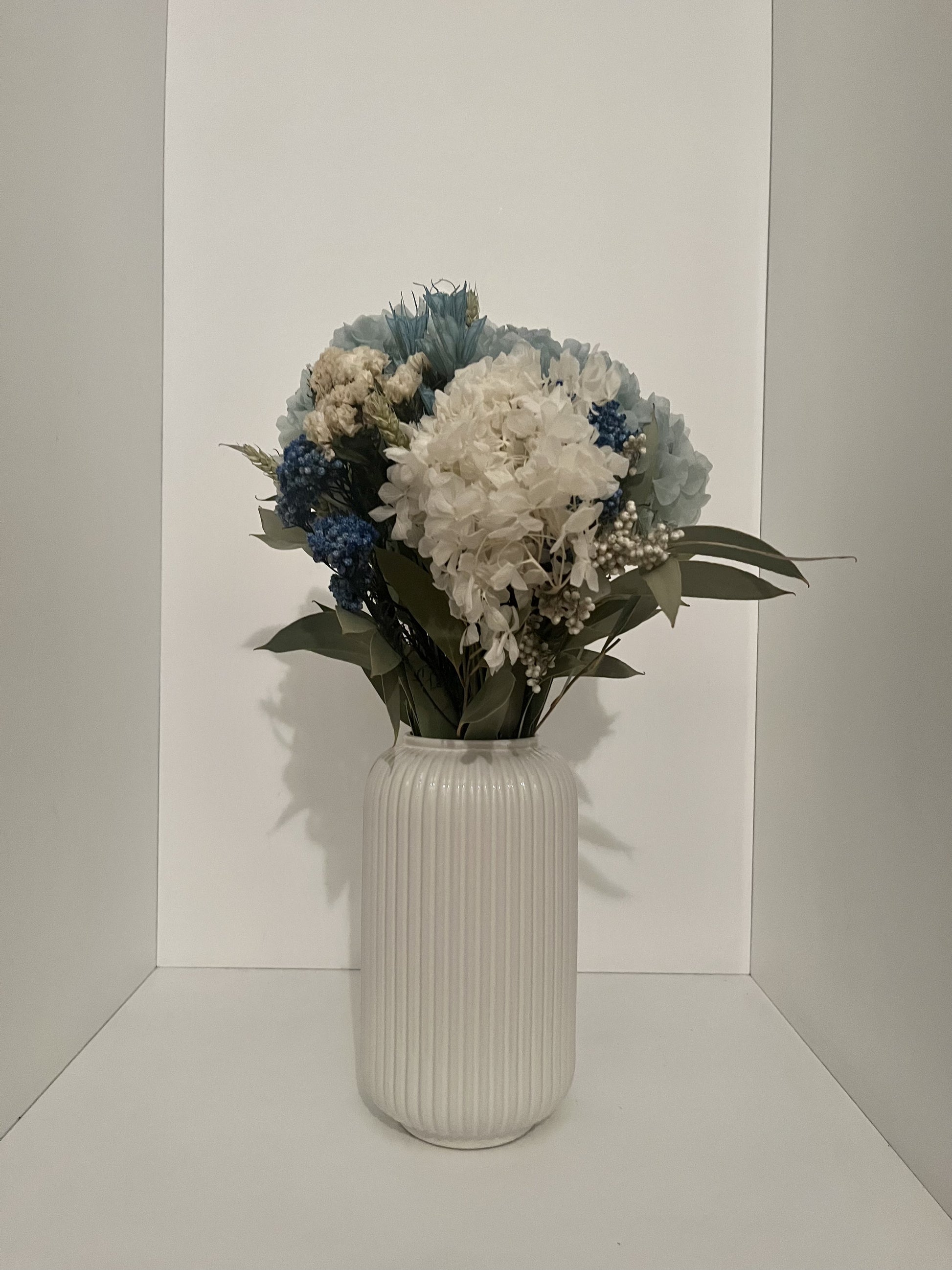 Immerse yourself in the Yves collection, a tribute to nature's elegance. The "Yves" stabilized flower arrangement seamlessly blends the delicate hue of Blue Light Hortensia, the pristine charm of White Hortensia, and the ethereal beauty of White Statice Sinuate. Enhanced by the timeless allure of Natural Diosmi and the soothing touch of Blue Diosmi, this masterpiece is artfully complemented by various natural leaves. Meticulously preserved, each element captures nature's finesse. Elevate your surroundings, capturing fleeting moments with this enchanting fusion of botanical artistry.